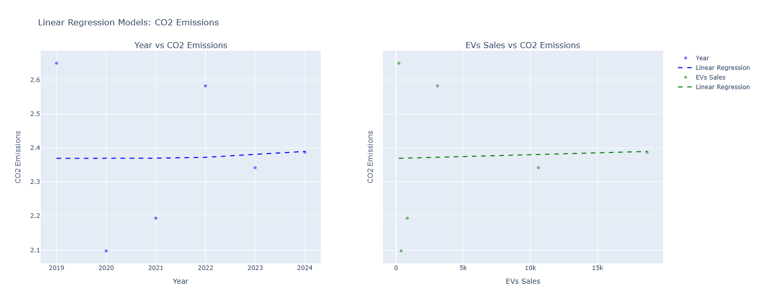 Based on the results of the linear regression models, there appears to be no significant relationship between the year and CO2 emissions from transportation, nor between EV sales and CO2 emissions. The R² values for both models are 0.00, indicating that neither variable explains any discrepancy in CO2 emissions. Additionally, the p-values for the independent variables are the following: 0.93 for Year and 0.94 for EV Sales. This suggests that the observed trends could be caused by other factors such as the pandemic which associates a reduction in carbon emissions due to the lack of vehicles in the road.